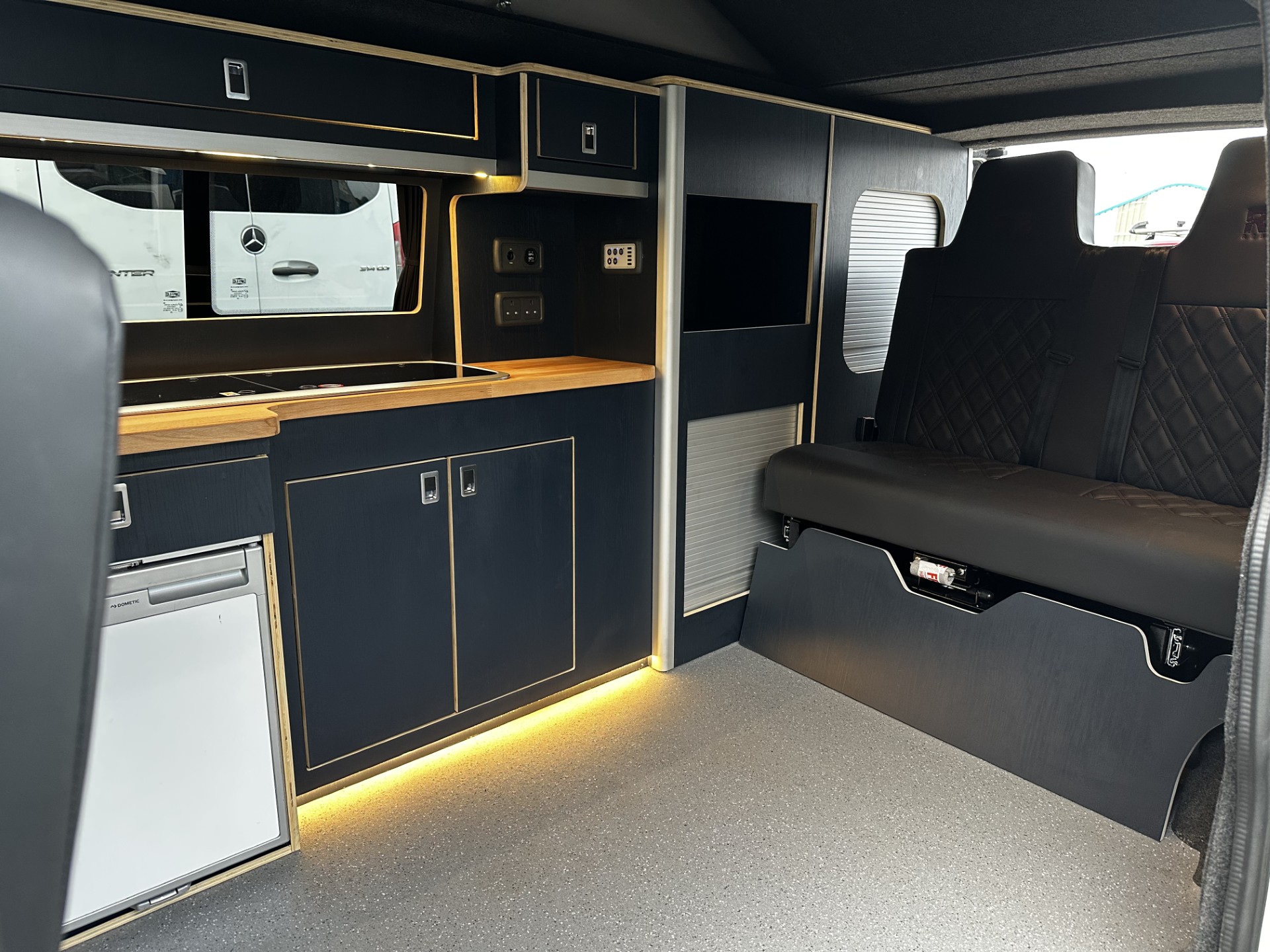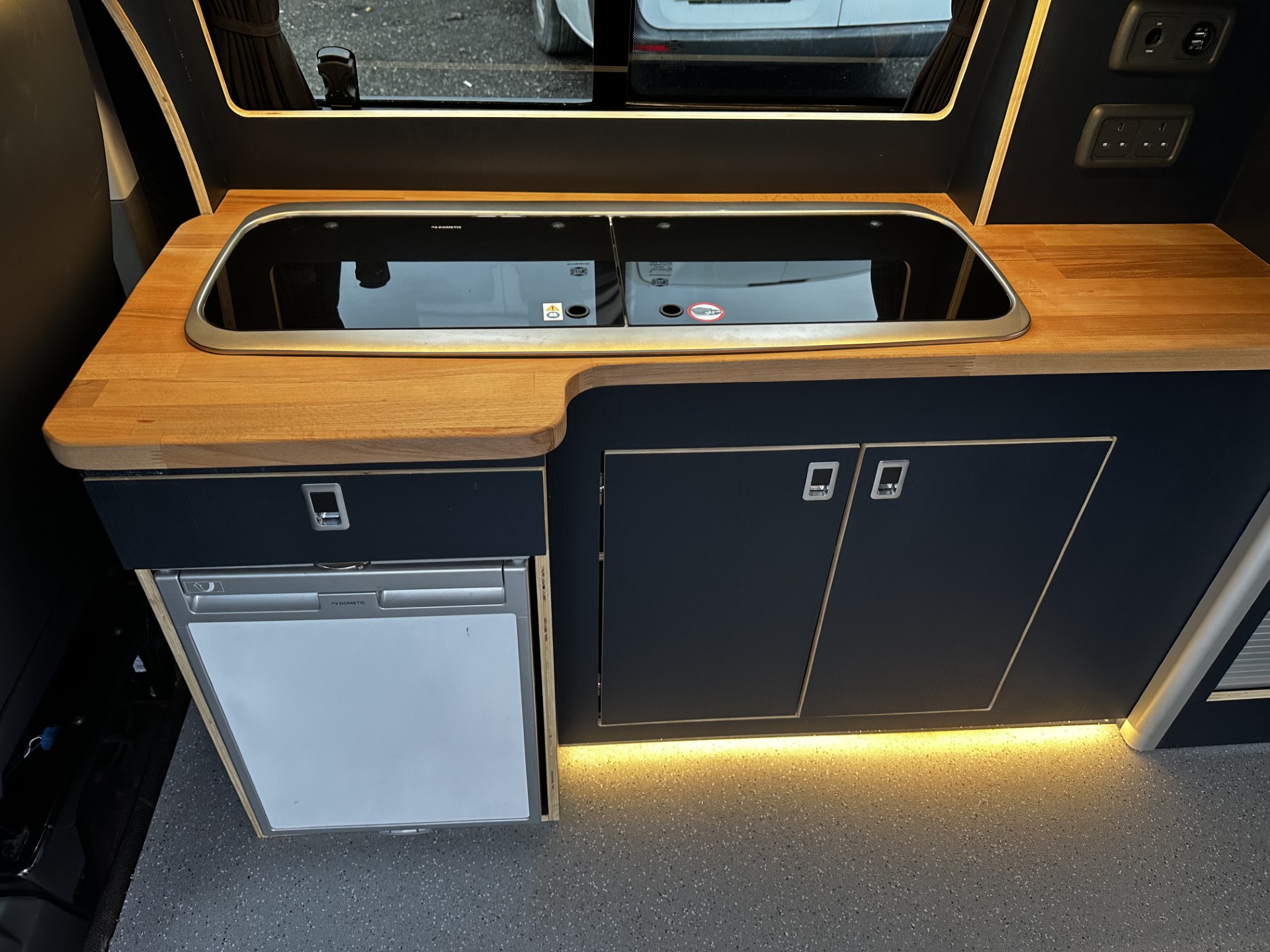 The conversion includes skyline pop-top with roof bed making the camper a 4 berth. It’s built with 2 stage insulation and carpet lining with one piece plywood floor with altro floor covering. The in house built kitchen unit with dometic 9222r sink and twin gas hob a microwave and 12v compressor 50ltr fridge.